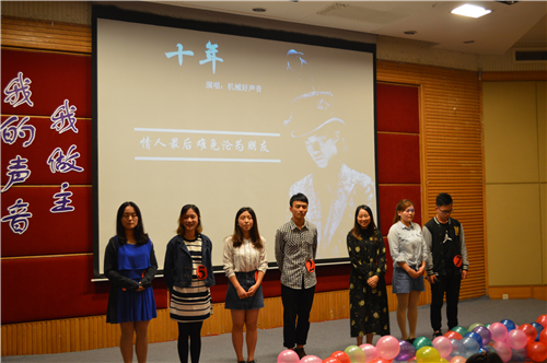 八位歌手合唱《十年》拉开了帷幕。第一轮八进六比赛,选手依次上场演唱,温柔深沉的《遗失的美好》,深情投入的《说谎》,桀骜不驯的《被驯服的象》,清澈细腻的《红颜旧》,动听的歌声回荡在7200。选手们纵情高歌,观众掌声不断。之后评委老师对选手进行点评,校园十佳歌手董思奇为大家演唱助兴,掀起全场高潮。第二轮帮帮唱环节,两两对战。世上最遥远的距离《飞鸟和鱼》,耳熟能详的《小酒窝》,并不平凡的《平凡之路》,进入第三轮比赛。中间穿插的有奖竞猜环节,为比赛增添许多欢乐。最终谭舒予夺得冠军。徐睿绮赢得亚军,陆晓艺赢得季军。最后,总支书记刘洋、杜力经理为冠亚军选手颁奖并合影留念。
