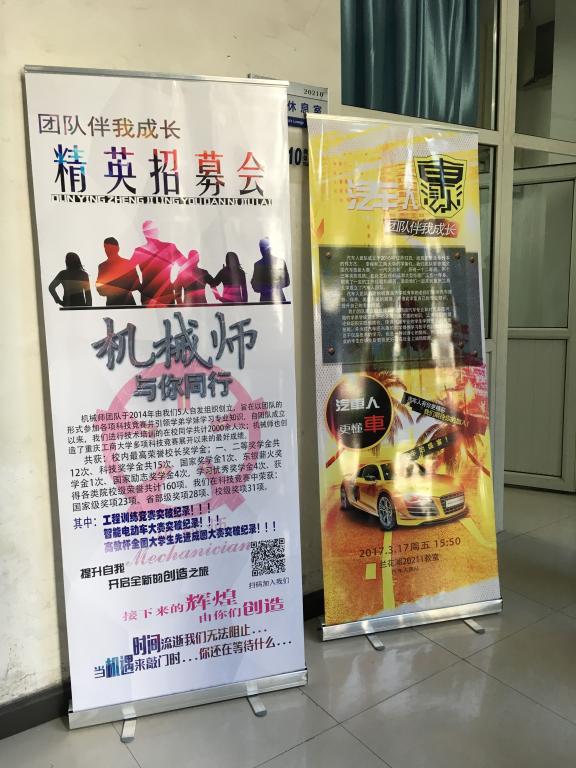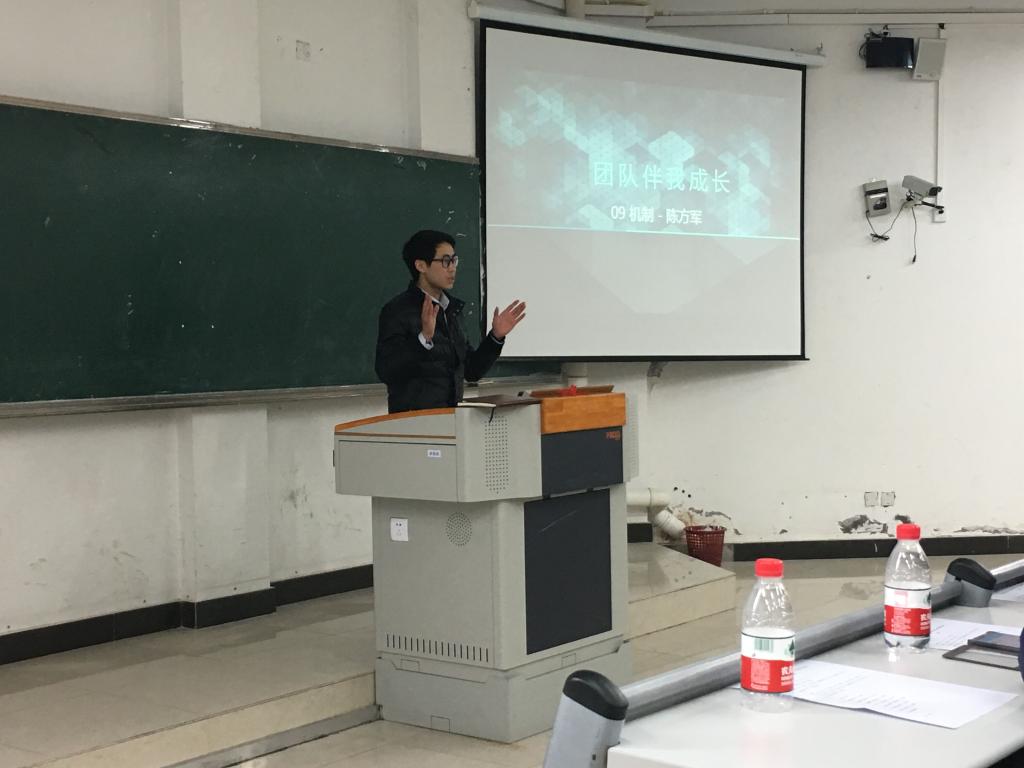 13级员工黄凯代表“机械师”团队招募,给大家分享了团队组建、成长的经历和今后的团队活动安排,并诙谐地向与会者提问:“你想成为大家眼中的大神吗?你想每年奖学金都是五位数吗?你想学会操作各种高大上的仪器吗?你想去荷兰交流吗?你想代表学校到全国各地比赛吗?——那么加入机械师团队吧!”博得了满场喝彩,也把整个招募活动推向了高潮。接下来14级员工郑方杰代表“汽车人”团队进行招募宣讲,他以讲故事的方式,回顾了从一年级在“打游戏中混过”到通过科技竞赛获得全国二等奖后免试专升本到公司的心理历程,从打工的经历再到创业思想的萌发,从而组建“汽车人团队”,他们告诉大家的是“只有经历过,才知道缺什么……”他们的招募词朴实,却是另一种感动。作为已毕业4年的昔日学院的卓越工程师”团队代表,在重庆海德世拉索系统有限公司就职的陈方军学长,从亲身经历学弟学妹们分享了“职业方向与学业方向、兴趣与价值相结合的辩证关系;融入圈子、建立平台的重要性”。