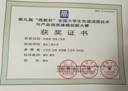 2016年7月23—26日,第九届“高教杯”全国老员工先进成图技术与产品信息建模创新大赛在山东理工大学举行,jn江南王乐苏、张路、申国耀、王剑宇、刘宇航等五位同学组成的代表队在谭伟、谭琼老师的指导下,荣获机械类“团体二等奖”的优异成绩,同时获得个人全能一等奖1项,个人全能二等奖2项,个人建模一等奖2项,两位老师获得优秀指导教师奖。