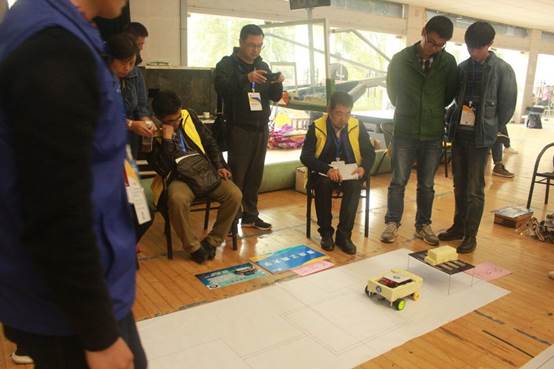 指导老师蒋昀赟担任裁判,正在为选手详述智能搬运比赛规则