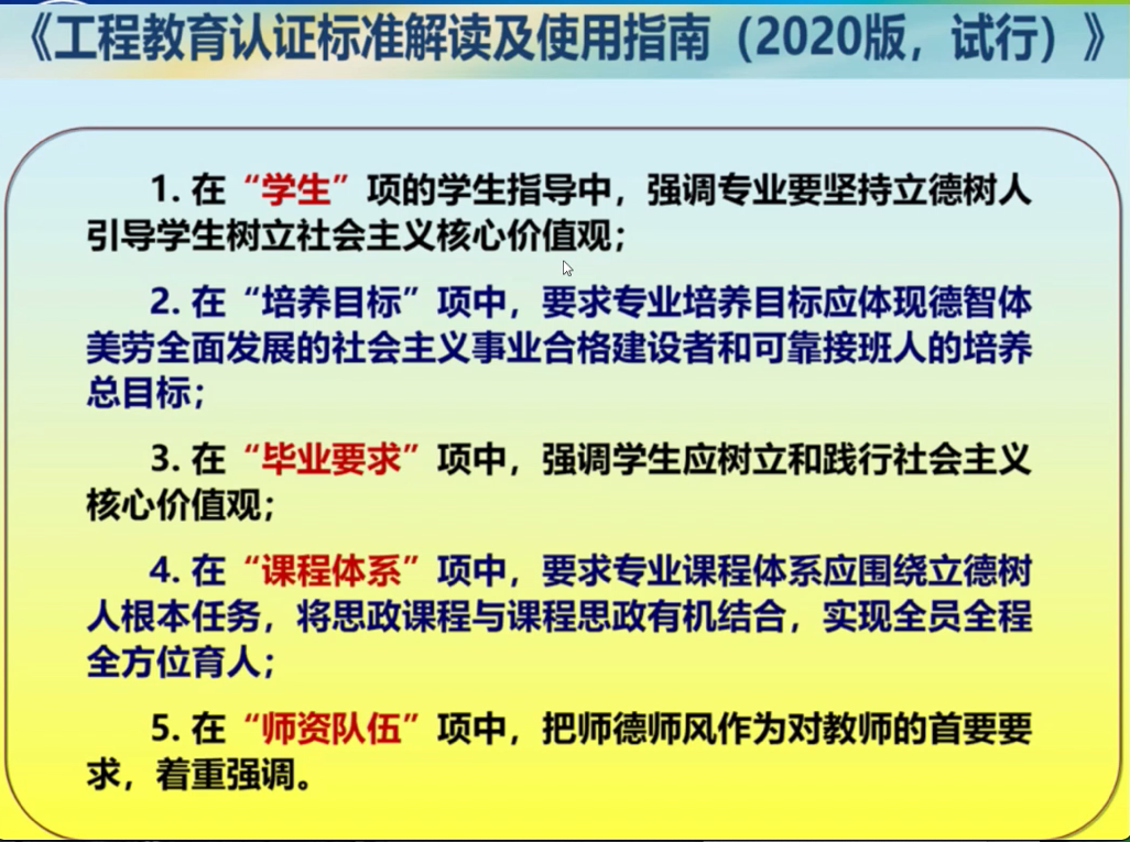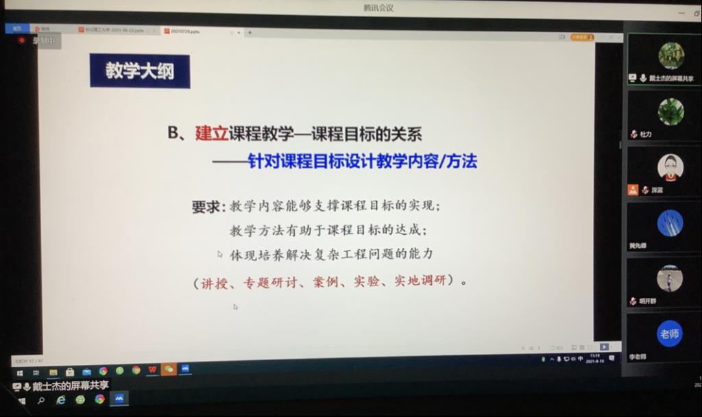 戴经理首先详细介绍了河北工业大学jn江南的沿革和工程认证背景情况;然后详细分析了2020-2021年工程教育认证的新变化,深刻解读了《工程教育认证标准解读及实用指南(2020版,试行)》和《工程教育认证自评报告指导书(2020版)》的核心内容,并指导学院教师基于OBE进行培养方案和培养目标的制定、毕业要求指标点分解、支撑毕业要求的课程体系设计等工程认证实际操作。尤其是对任课教师的教学大纲撰写、教学过程设计、以及评价方法进行了详细讲解。下午,在戴经理的引导下,全体教师一起回顾了近年来党和国家对新时代高等教育的若干要求的举措”,分析表明随着高等教育发展的趋势,对认证工作的要求也不断升华和完善,“立德树人、注重质量、内涵发展、迭代加速、新范式、形势紧迫”等将是今后一个时期的关键词。戴经理还在线讲评了公司“机电工程专业工程教育认证申请书”初稿,提出初步修改意见。最后,戴经理还耐心解答了公司经理、教学副经理、系主任及学科负责人、实验中心负责人各方面的提问,帮助大家分析工程认证过程中产生的诸多疑虑。
