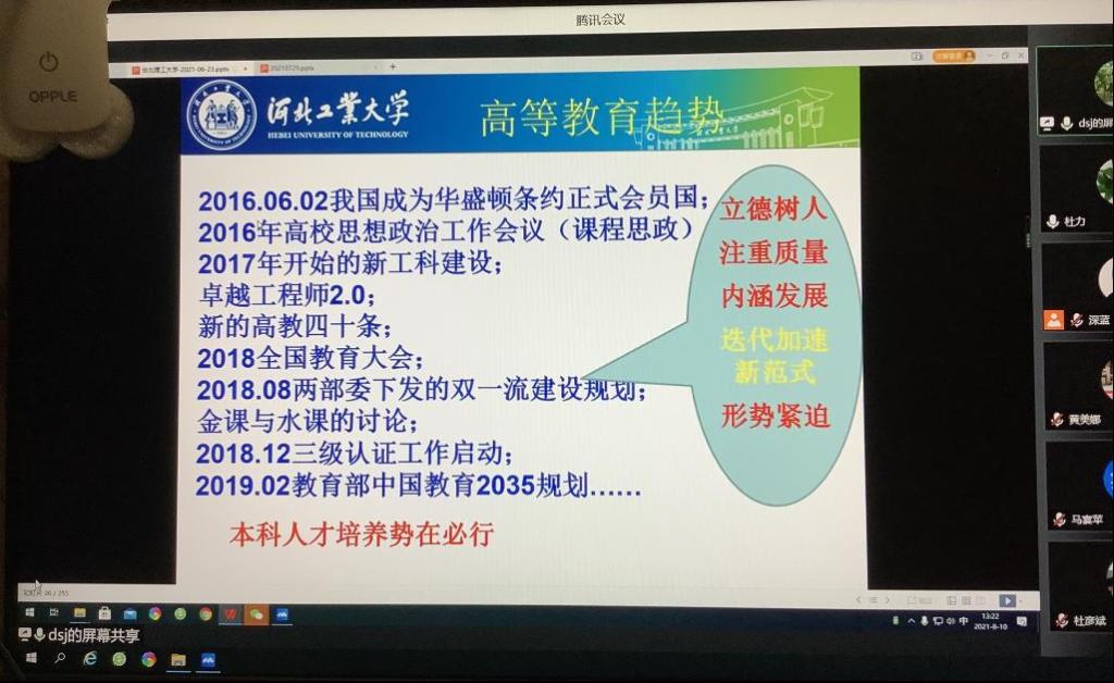 2021年8月10日,江南体育官方网站机械工程学既定的“工程教育认证培训大会”因疫情原因,由线下转为线上进行。河北工业大学jn江南戴士杰经理应邀为学院全体教职工做了两场全面又深入的“工程教育认证培训”。上午报告的主题是“面对工程专业教育认证,学院层面的应该做的系列工作”,下午报告的主题是“新时代高等教育的要求”,两场培训报告均面向jn江南全体教职工,有84位教师全程参加了培训,会议由杜力经理主持。