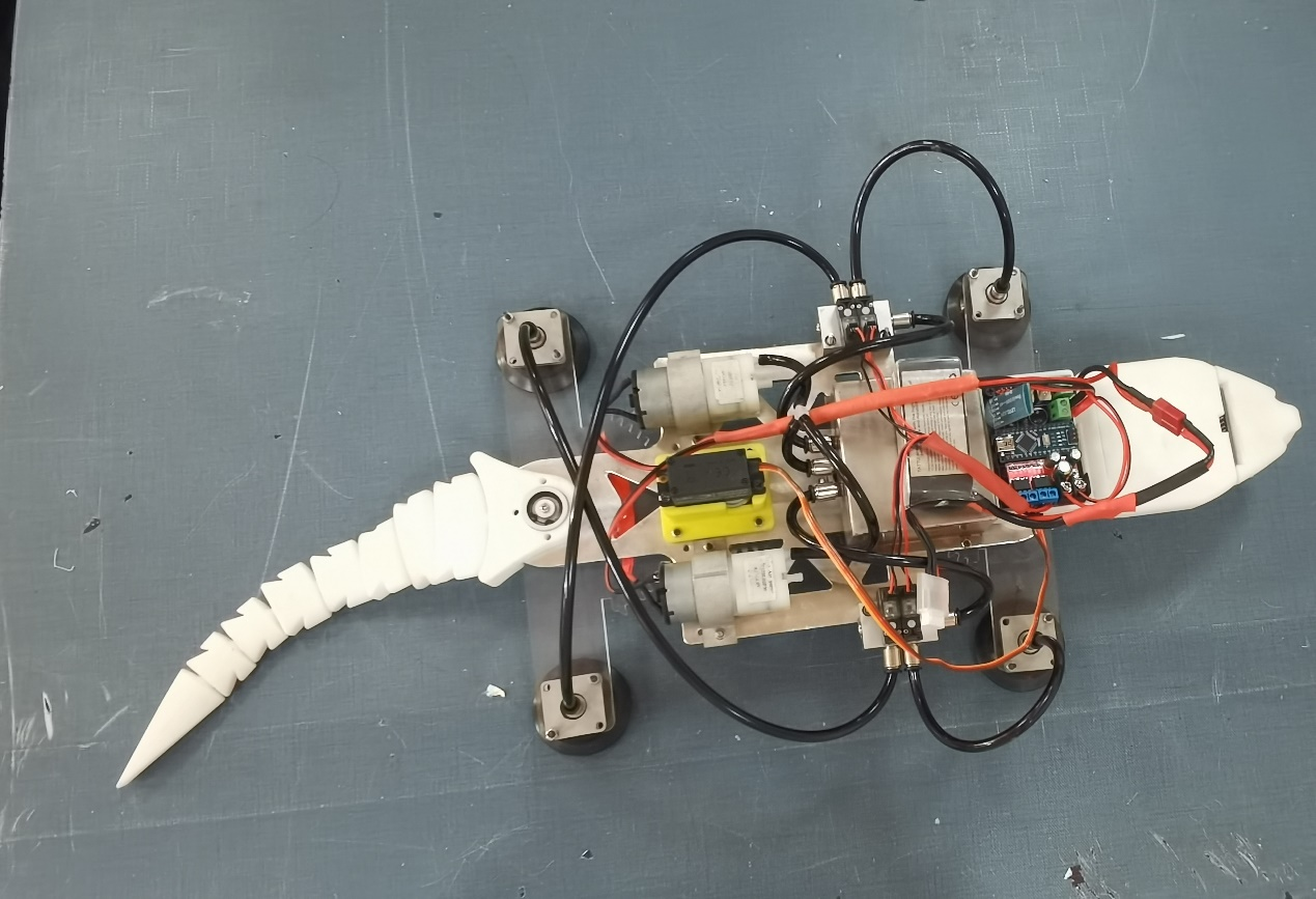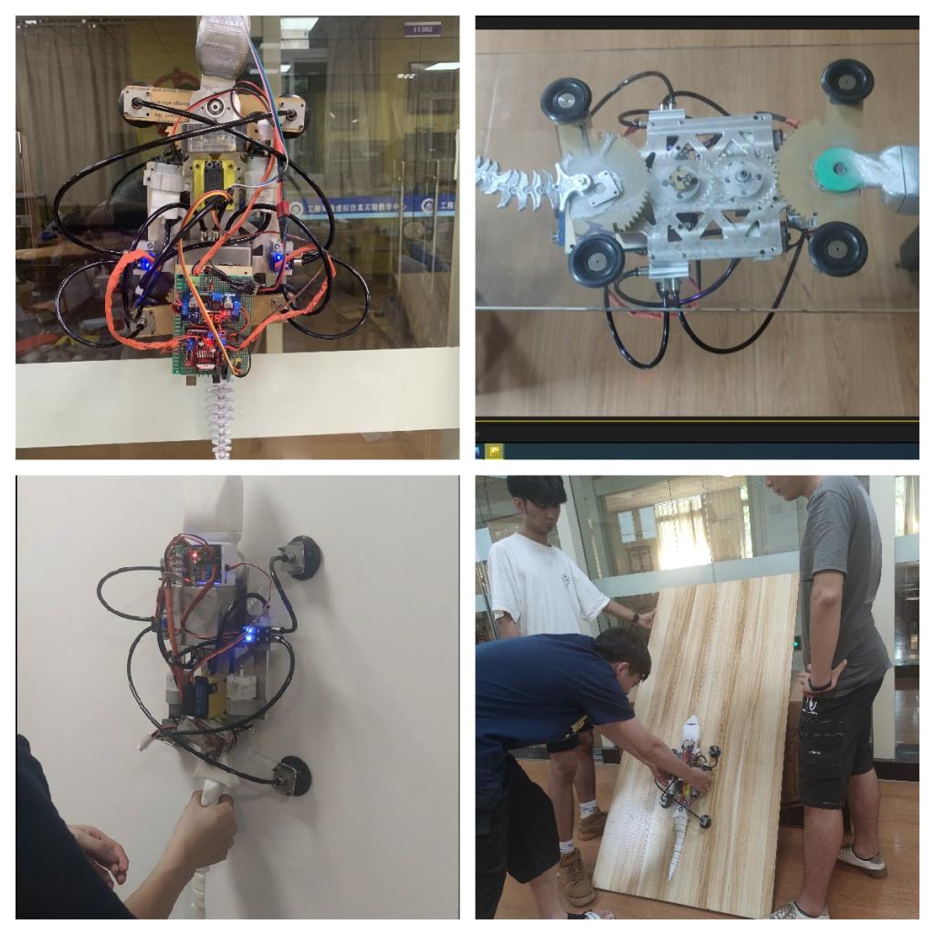 “雄心迈步象牙塔,棋逢对手敢亮剑”。公司参赛作品—仿生壁虎机器人团队的同学们,通过观测与研究壁虎的步态与爬行特点,灵活应用齿轮连杆传动机构创新地设计了单源控制,四足协控的机器壁虎,为了便于吸附墙壁进行爬行,设计了包含微型真空泵、微型电磁阀、真空保护阀、真空储备罐、真空吸盘等部件的真空吸附系统,确保壁虎可以在玻璃或垂直墙壁安全、稳固的爬行。此外,团队的同学们还对仿生壁虎机器人进行了电控系统设计。一方面,利用模块化的概念,对主控板进行了PCB制版设计与加工,强化了其功能模块的快换与扩展功能,同时使电控模块具备了体积小,易安装,高可靠等特点,另一方面,应用C语言对吸附系统、机械传动系统、智慧功能模块进行编程,使得该机器人系统能够安全、稳定地完成垂直墙面爬行(玻璃墙体、建筑外墙、室内墙体等)、转弯、避障,陡坡爬行与避障、远程控制等多种功能,可用于民用外侧高墙及玻璃墙体的清洁,以及桥隧高壁的结构检测等任务。
