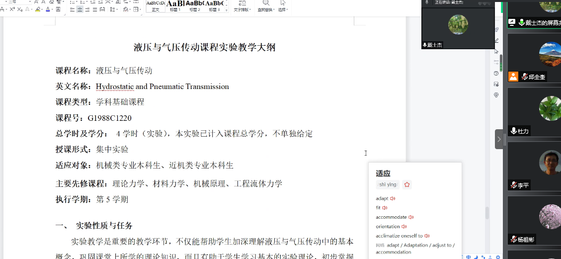 戴士杰教授首先在报告中对学院2021版专业认证的专家反馈意见进行了解读和分析,指出以后申请的注意事项。通过《液压与气压传动》、《工程图学Ⅰ》、《先进制造技术》、《汽车工程学A》等课程的教学大纲案例,说明了教学大纲中怎样融合课程思政元素,课程目标如何支撑毕业要求。