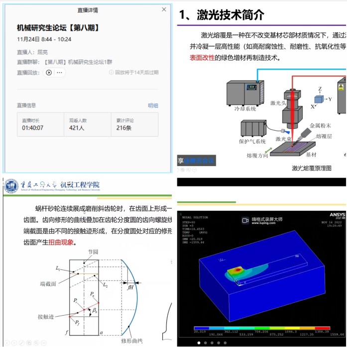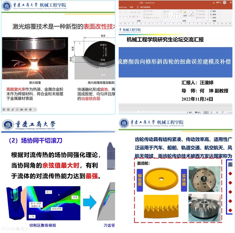 会上,7名研究生分别从激光熔覆和机器切削的加工方法建模等不同方面对绿色制造的研究现状及多种方法进行了汇报。何浪同学从流体仿真方面讲述了机器切削的加工方法建模,主要从干切滚刀失效机制的有限元仿真方面进行相关机制的分析;张文平同学从激光熔覆方面讲述了相关工艺的研究内容,主要对激光熔覆材料研究与工艺参数进行简要介绍;李志强同学从建模方面介绍了多道激光熔覆搭接率的研究方法;汪澳婷同学从有限元建模方面介绍了磨削齿向修形斜齿轮扭曲相关研究;毛恺奕同学从数值方面讲述了激光熔覆技术的数值模拟研究;陈勇全同学从加工方法方面讲述了车面齿轮展成磨削的研究;彭云川同学从性能方面讲述了多能场辅助激光熔覆对熔覆层的影响。